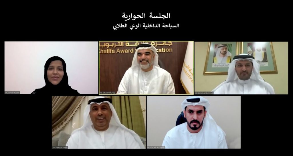 This was reflected during the dialogue session organized by the General Secretariat of Khalifa Award for Education and titled “ Domestic Tourism and Student Awareness”, in the presence of Amal Afifi, Secretary General to the Award and the speakers Ismael Abdullah Al Hammadi, Director of the Cultural Heritage Department at the Ministry of Culture and Youth, Amna Muhammed Al Zaabi, Deputy Director of the Guest Experience Department at the Tourism Product Development Management, Department of Culture and Youth, Dawood Muhammed Al Maleeh, Curricula Development Specialist at the Ministry of Education and Obaid Al Teneeji, Arbitrator at Khalifa Award for Education.